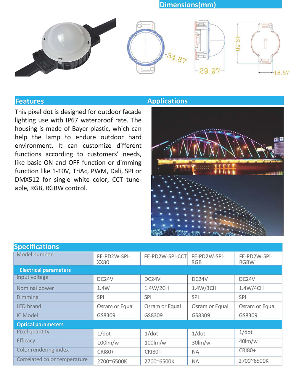 This pixel dot is designed for outdoor facade lighting use with IP67 waterproof rate. The housing is made of Bayer plastic, which can help the lamp to endure outdoor hard environment. It can customize different functions according to customers’ needs, like basic ON and OFF function or dimming function like 1-10V, TriAc, PWM, Dali, SPI or DMX512 for single white color, CCT tune-able, RGB, RGBW control.